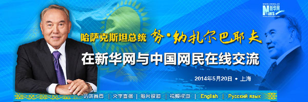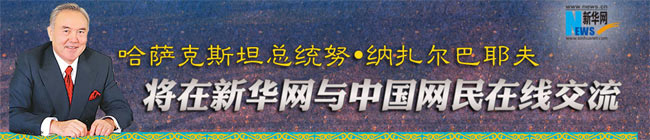 ????新華網(wǎng)上海5月20日電 哈薩克斯坦總統(tǒng)納扎爾巴耶夫20日接受新華網(wǎng)獨家訪談與中國網(wǎng)民在線交流,回答中國網(wǎng)民的問題。