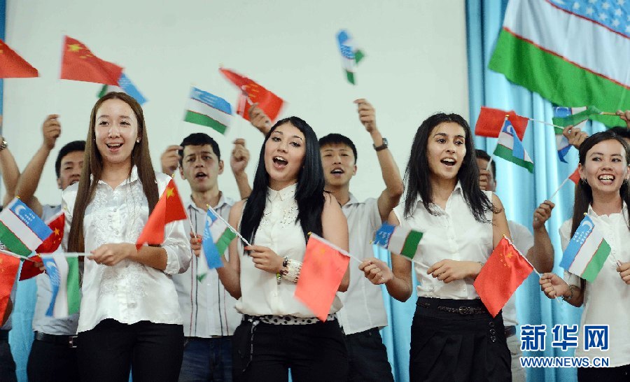 6月9日,學生代表在烏茲別克斯坦首都塔什干的烏世界語言大學禮堂表演節(jié)目。