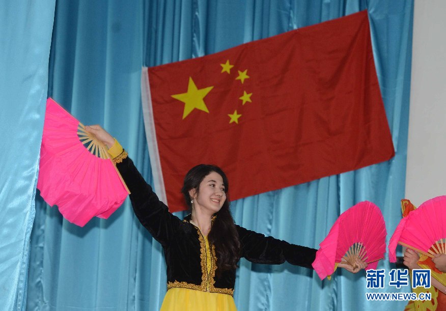 6月9日,學生代表在烏茲別克斯坦首都塔什干的烏世界語言大學禮堂表演節(jié)目。
