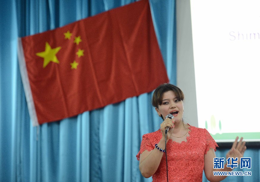 6月9日,學(xué)生代表在烏茲別克斯坦首都塔什干的烏世界語言大學(xué)禮堂表演節(jié)目。