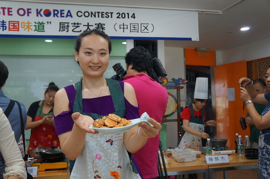 ????6月28日,駐華韓國(guó)文化院,2014“韓國(guó)味道”廚藝大賽現(xiàn)場(chǎng)。圖為獲勝選手沈振華和她的獲獎(jiǎng)菜品。新華網(wǎng) 王俊景 攝