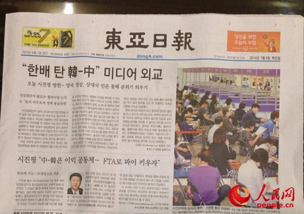??? 韓國《東亞日報》在頭版顯著位置刊發(fā)習(xí)近平主席署名文章《加快自貿(mào)區(qū)談判進(jìn)程 做大利益蛋糕》金慧廷 攝