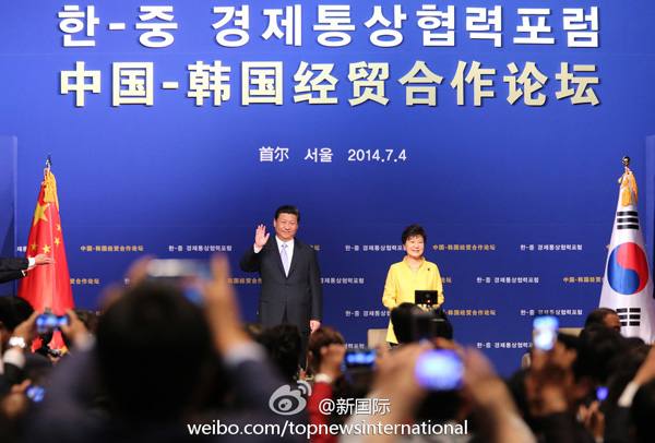 新華網(wǎng)北京7月4日電 據(jù)新華社“新國際”微博報道,習(xí)近平表示,中韓應(yīng)共同反對保護(hù)主義,兩國企業(yè)可以在制定國際標(biāo)準(zhǔn)、開拓國際市場、參與區(qū)域一體化進(jìn)程等方面加強(qiáng)探討、拓展合作。中方歡迎韓國參與亞洲基礎(chǔ)設(shè)施投資銀行籌建,共同推動地區(qū)互聯(lián)互通和基礎(chǔ)設(shè)施建設(shè)。