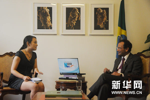 ??? 圖為巴西駐華大使瓦爾德馬爾·卡爾內(nèi)魯·萊昂(右)接受新華網(wǎng)專(zhuān)訪。新華網(wǎng)記者 劉小軍攝