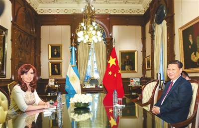 7月18日,國(guó)家主席習(xí)近平在布宜諾斯艾利斯同阿根廷總統(tǒng)克里斯蒂娜舉行會(huì)談,兩國(guó)元首就中阿關(guān)系及共同關(guān)心的問題深入交換意見,達(dá)成重要共識(shí),一致決定將中阿關(guān)系提升為全面戰(zhàn)略伙伴關(guān)系,堅(jiān)定把對(duì)方視為重要發(fā)展機(jī)遇和發(fā)展伙伴,加強(qiáng)互利合作和戰(zhàn)略協(xié)作,造福兩國(guó)和兩國(guó)人民,增強(qiáng)新興市場(chǎng)國(guó)家和發(fā)展中國(guó)家團(tuán)結(jié)合作。