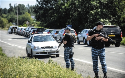 7月28日,來自澳大利亞和荷蘭的調查人員前往墜機現場途中,烏克蘭民間組織在其車隊后面封鎖道路。