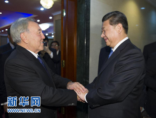 習(xí)近平指出,這是我們今年第四次見面。中哈保持密切高層交往,充分體現(xiàn)了中哈全面戰(zhàn)略伙伴關(guān)系的高水平和特殊性,對指導(dǎo)兩國關(guān)系發(fā)展非常重要。今年5月你對中國進行國事訪問并出席亞洲相互協(xié)作與信任措施會議第四次峰會,我們當時達成的各項共識正得到有效落實。你關(guān)心的擴大哈方農(nóng)產(chǎn)品和礦產(chǎn)資源對華出口問題,我已責成中方有關(guān)部門研究并正在積極解決。
