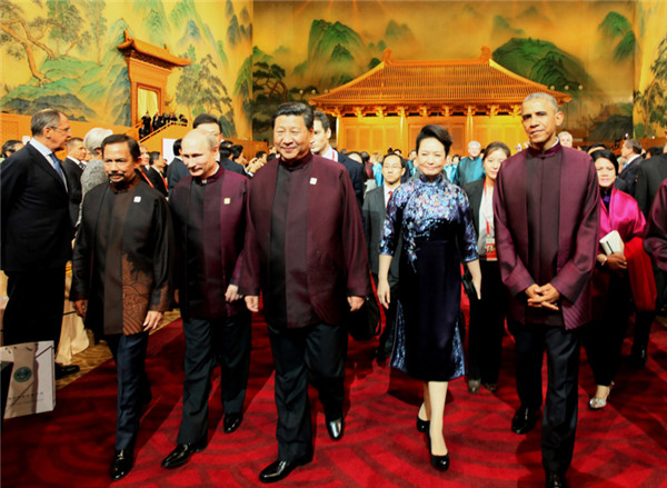 ????18時許,與會貴賓穿著為本次會議專門設(shè)計的特色中式服裝陸續(xù)抵達。習(xí)主席說,貴賓們都穿著中國式服裝,讓大家更感親近,就像到鄰居家串門,來朋友家敘舊一樣。