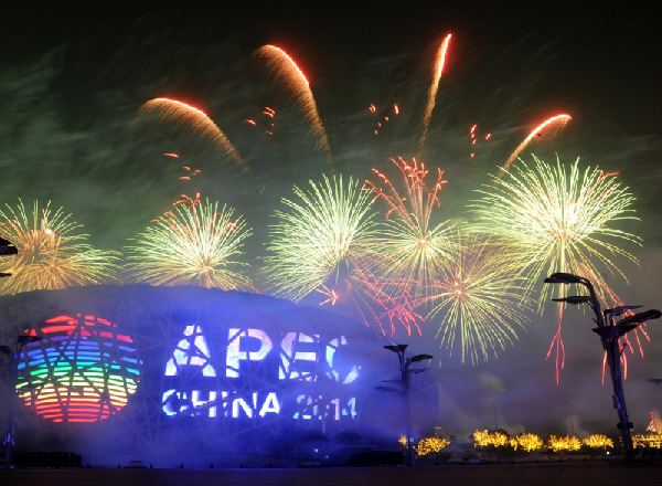 17時40分許,水立方和鳥巢的彩燈已經(jīng)在夜色中閃亮。當(dāng)晚,國家主席習(xí)近平和夫人彭麗媛在北京國家游泳中心(水立方)舉行宴會,歡迎出席APEC會議的各成員經(jīng)濟體領(lǐng)導(dǎo)人或代表及配偶。