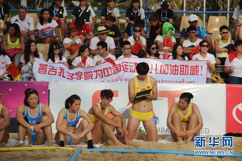 ??? 11月16日,中國沙灘手球運動員們比賽中場休息。中國體育代表團16日在泰國普吉舉行的第四屆亞洲沙灘運動會上勇奪2枚金牌和2枚銅牌。當天比賽全部結(jié)束時,中國隊以3金2銀5銅的成績暫列獎牌榜第五。新華社發(fā)(塔納攝)