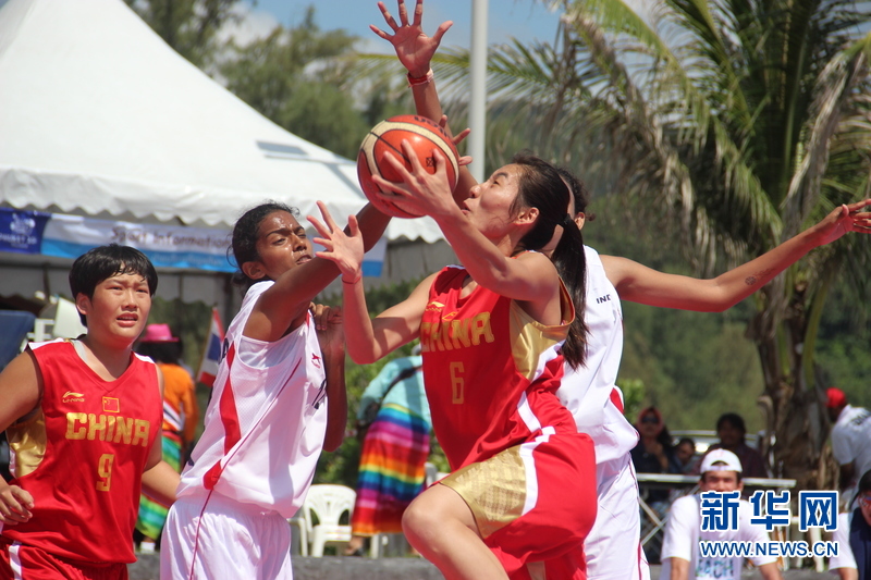 ??? 11月16日,中國沙灘籃球運(yùn)動(dòng)員房玲玲(左三)與安靜(左一)在比賽中。中國體育代表團(tuán)16日在泰國普吉舉行的第四屆亞洲沙灘運(yùn)動(dòng)會(huì)上勇奪2枚金牌和2枚銅牌。當(dāng)天比賽全部結(jié)束時(shí),中國隊(duì)以3金2銀5銅的成績暫列獎(jiǎng)牌榜第五。新華社發(fā)(塔納攝)