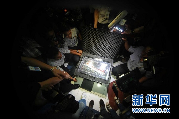 ??? 1月12日,在印度尼西亞雅加達(dá),工作人員打開裝有亞航失事客機(jī)黑匣子的箱子。印度尼西亞國(guó)家交通安全委員會(huì)主席塔唐·庫(kù)爾尼亞迪12日說,搜救人員當(dāng)天早上打撈起的失事亞航客機(jī)其中一個(gè)黑匣子——飛行數(shù)據(jù)記錄器狀態(tài)良好。新華社發(fā)(阿貢攝)