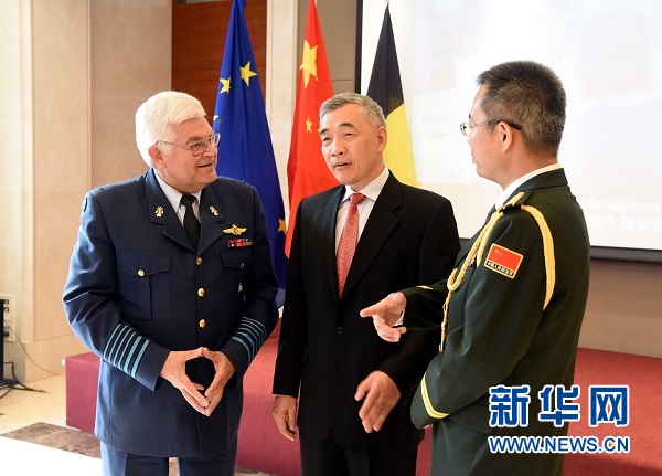 ??? 7月23日,中國(guó)駐比利時(shí)大使曲星(中)、比利時(shí)國(guó)防參謀長(zhǎng)范卡倫貝格(Gerard Van Caelenberge)(左)與中國(guó)駐比利時(shí)王國(guó)陸、海、空三軍武官郜彤在招待會(huì)上友好交談。新華社記者姜巖攝