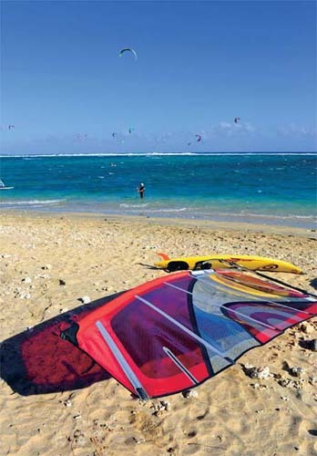 我們?cè)诹裟嵬膸滋鞎r(shí)間里風(fēng)浪都比較大,不過來到海邊卻發(fā)現(xiàn)海灘上依舊人聲鼎沸,原來好動(dòng)的法國人和一些歐美游客正利用風(fēng)浪玩起了刺激的海上運(yùn)動(dòng)。幾米高的海浪中早已有了十多名沖浪好手相繼嘗試挑戰(zhàn),雖然他們中的大部分只是業(yè)余愛好,并非職業(yè)沖浪選手,不過一招一式也是頗為認(rèn)真??拷0陡浇臏\水區(qū)則更多是風(fēng)帆、摩托艇、皮劃艇、海浪滑板等各項(xiàng)水上運(yùn)動(dòng)的世界,對(duì)于他們來說,大風(fēng)就是運(yùn)動(dòng)的動(dòng)力,海水就是運(yùn)動(dòng)的場地。一般島上的家庭都會(huì)趁著周末舉家開車來到海邊,喜歡玩水的玩水,而其他家庭成員則在沙灘上聚餐或者聊天,如此融入大自然真是瀟灑。