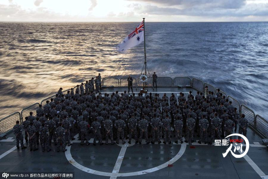 從南中國(guó)海、馬六甲海峽,再到南印度洋。馬航MH370的搜救工作可謂是一波三折。2014年4月26日,參加馬航失聯(lián)航班搜尋的澳大利亞海軍士兵參加澳紐軍團(tuán)日黎明升旗儀式。