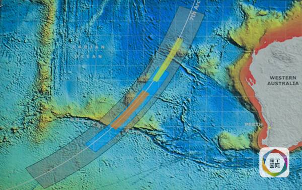 6月26日,澳方宣布,根據(jù)多國(guó)衛(wèi)星專家小組對(duì)已有衛(wèi)星信息進(jìn)行的重新分析,MH370航班的搜尋將轉(zhuǎn)入新區(qū)域,新搜索區(qū)域位于“藍(lán)鰭金槍魚”此前搜索區(qū)域以南,距離西澳大利亞海岸約1800公里,面積約6萬(wàn)平方公里,仍在根據(jù)衛(wèi)星與飛機(jī)“握手”信息而確定的第七條弧線上。圖為澳方公布的新區(qū)域,橙色區(qū)域是優(yōu)先級(jí)最高的搜尋區(qū),藍(lán)色區(qū)次之。(新華社記者徐海靜攝)
