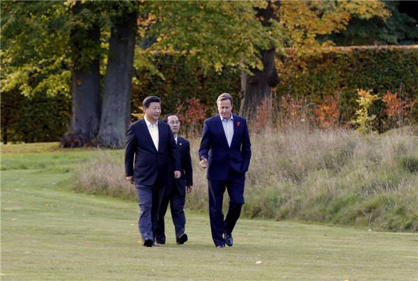傍晚時分,習近平主席來到距倫敦市區(qū)約1小時車程的契克斯首相鄉(xiāng)間別墅,同卡梅倫一起散步,并舉行小范圍會晤。