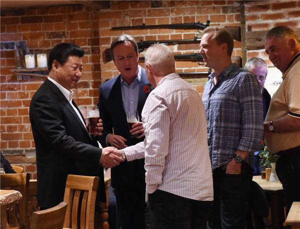 10月22日,國家主席習近平在契克斯首相鄉(xiāng)間別墅同英國首相卡梅倫再次會晤。會晤結(jié)束后,習近平在卡梅倫陪同下乘車前往當?shù)匦℃?zhèn)體驗酒吧文化。(新華社記者饒愛民攝)