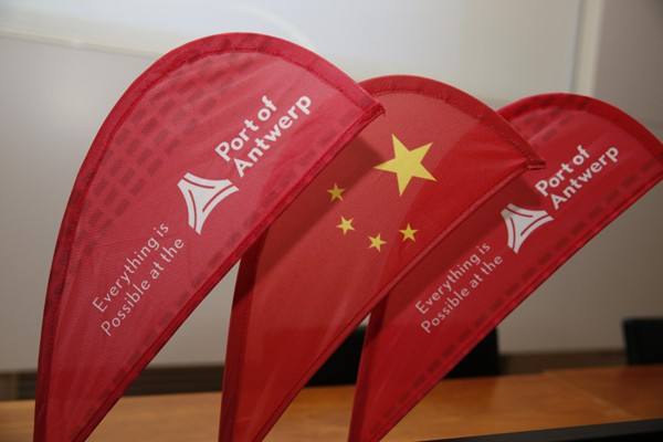 ↑會場的中國國旗與安特衛(wèi)普港標(biāo)識。