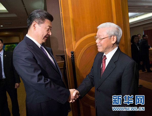 11月6日,中共中央總書記、國(guó)家主席習(xí)近平在河內(nèi)再次會(huì)見越共中央總書記阮富仲。 新華社記者蘭紅光攝