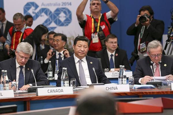 2014年11月15日,G20第九次峰會(huì)在澳大利亞布里斯班舉行。國家主席習(xí)近平出席會(huì)議并發(fā)表題為《推動(dòng)創(chuàng)新發(fā)展 實(shí)現(xiàn)聯(lián)動(dòng)增長》的重要講話。 新華社發(fā)