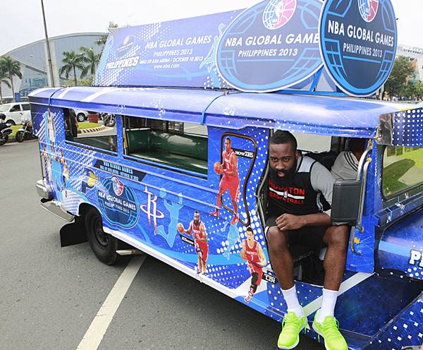 2013年10月8日,休斯敦火箭隊(duì)在菲律賓馬尼拉進(jìn)行調(diào)整訓(xùn)練期間,火箭隊(duì)球員哈登坐在一輛“吉普尼”巴士上。新華社發(fā)(宋穹攝)