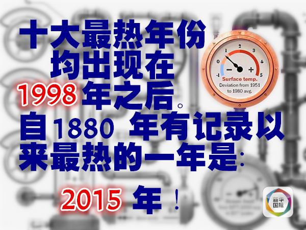 由于厄爾尼諾等現(xiàn)象的作用,地球每年平均氣溫略有差異不足為奇。但縱觀1880年有可靠記錄以來的歷年氣溫狀況可以看出,地球表面溫度呈爬高之勢(shì),10個(gè)氣溫最高的年份都出現(xiàn)在1998年之后,而2015年是目前為止最熱的一年。