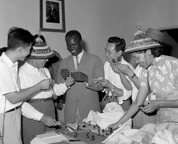中非人民友好協(xié)會代表團(tuán)在1961年2月24日到6月19日的四個(gè)月中,訪問了幾內(nèi)亞、馬里、加納、尼日爾等八個(gè)西非國家。圖為非洲朋友向代表團(tuán)贈送禮品。(新華社記者孟憲全攝)