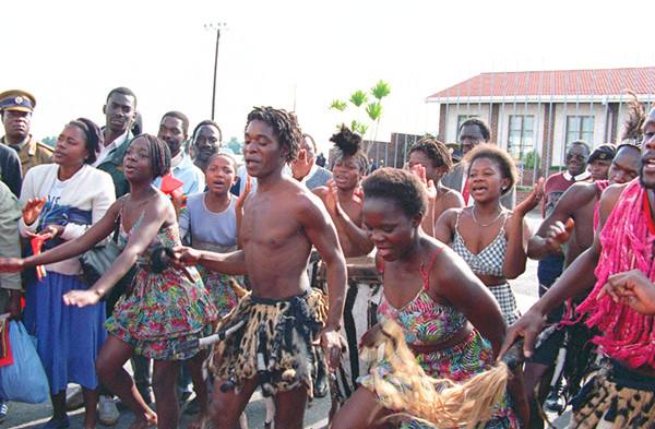1996年5月22日,津巴布韋首都哈拉雷群眾載歌載舞,歡送中國國家主席江澤民。1996年5月8日至22日,時(shí)任中國國家主席江澤民對非洲六國進(jìn)行了友好訪問。(新華社記者王新慶攝)