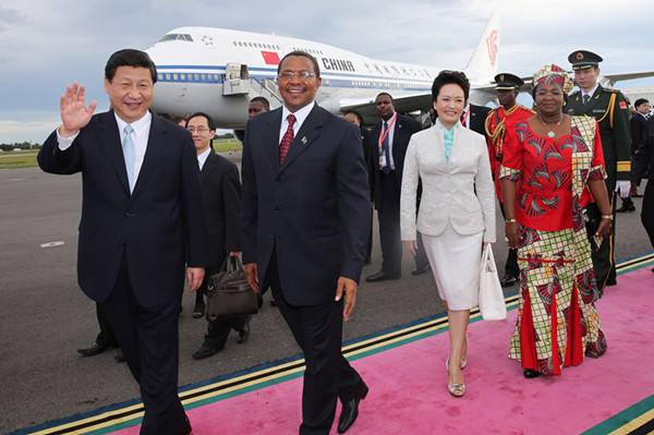 圖為2013年3月24日,國家主席習(xí)近平乘專機(jī)抵達(dá)達(dá)累斯薩拉姆尼雷爾國際機(jī)場,開始對坦桑尼亞進(jìn)行國事訪問。坦桑尼亞總統(tǒng)基奎特和夫人到機(jī)場迎接習(xí)近平和夫人彭麗媛。(新華社記者 蘭紅光攝)