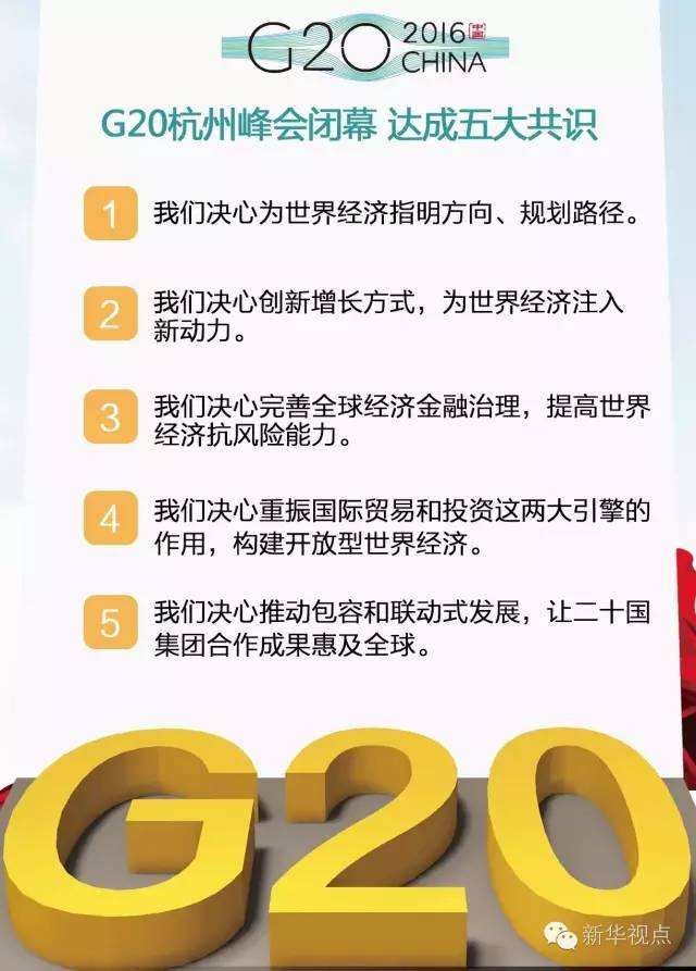 從4日下午,習(xí)近平主席敲下木槌,宣布峰會開幕,至5日下午峰會閉幕。一天半的時間,領(lǐng)導(dǎo)人在峰會上圍繞會議主題和重點議題進行了熱烈而富有成果的討論,就加強政策協(xié)調(diào)、創(chuàng)新增長方式,全球經(jīng)濟金融治理,國際貿(mào)易和投資,包容和聯(lián)動式發(fā)展等議題,以及影響世界經(jīng)濟的其他突出問題,深入交換看法,達成許多重要共識。
