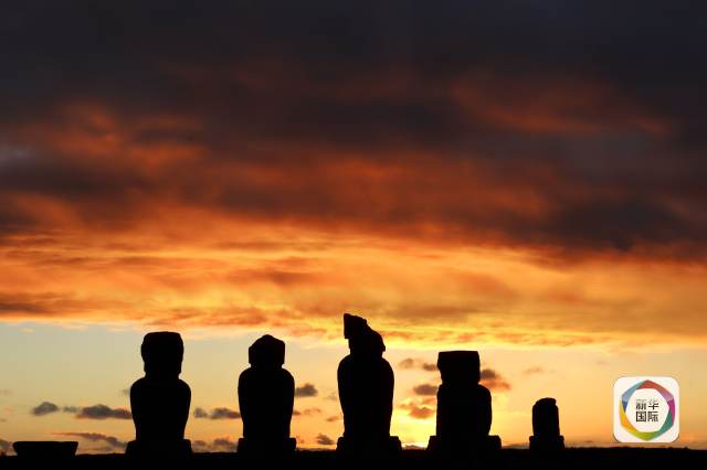 復活節(jié)島上的巨人石像排成一列。(新華社記者葉書宏攝)