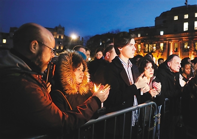 3月23日,在英國倫敦特拉法加廣場,人們參加燭光守夜悼念活動(dòng)。新華社記者 韓 巖攝