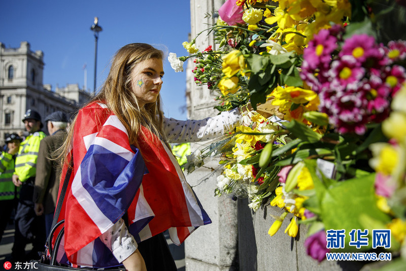 英國(guó)民眾在議會(huì)外擺放鮮花 哀悼恐襲受害者(組圖)