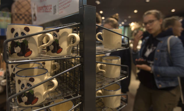 ↑7月5日,在德國柏林動(dòng)物園,顧客挑選印有熊貓圖案的杯子。