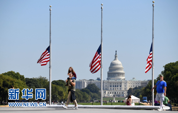 10月2日,在美國首都華盛頓,國會(huì)山附近的美國國旗降至旗桿中部。新華社記者 殷博古 攝
