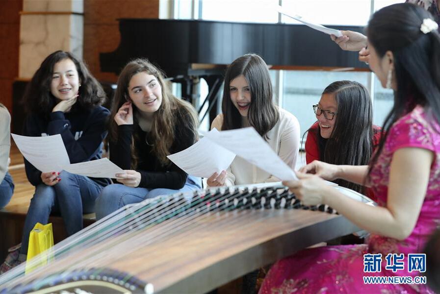 2017年5月5日,在中國駐美國紐約總領(lǐng)館舉行的“感知中國”活動中,一名老師為美國學生展示古箏彈奏。新華社記者王迎攝