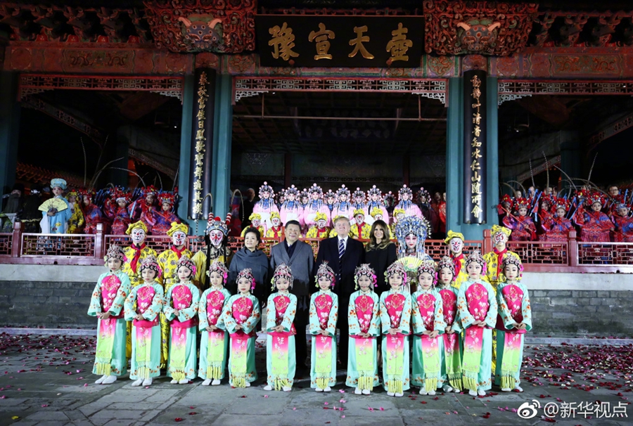 新華網(wǎng)北京11月8日電? 國家主席習(xí)近平和夫人彭麗媛8日下午在故宮暢音閣與來華進行國事訪問的美國總統(tǒng)特朗普和夫人梅拉尼婭共同欣賞京劇表演。兩國元首夫婦觀看了《梨園春苗》《美猴王》《貴妃醉酒》三個精彩劇目。來賓們陣陣掌聲和聲聲喝彩不絕于耳。演出結(jié)束后,兩國元首夫婦同參加演出的演員們合影。(攝影:蘭紅光;文字:孫奕 據(jù)新華社“新華視點”微博報道)