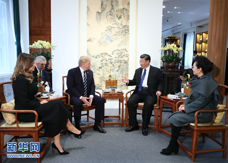 習(xí)近平和夫人彭麗媛同美國總統(tǒng)特朗普和夫人梅拉尼婭茶敘