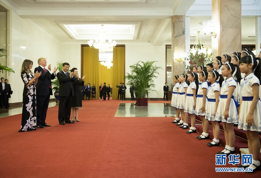 11月9日,國家主席習近平在北京人民大會堂東門外廣場舉行歡迎儀式,歡迎美利堅合眾國總統(tǒng)唐納德·特朗普對中國進行國事訪問。這是習近平和夫人彭麗媛同特朗普夫婦在人民大會堂欣賞文藝表演。新華社記者 李學仁 攝