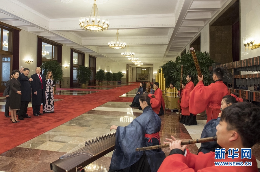 11月9日,國家主席習(xí)近平在北京人民大會(huì)堂東門外廣場(chǎng)舉行歡迎儀式,歡迎美利堅(jiān)合眾國總統(tǒng)唐納德·特朗普對(duì)中國進(jìn)行國事訪問。這是習(xí)近平和夫人彭麗媛同特朗普夫婦在人民大會(huì)堂欣賞文藝表演。新華社記者 李學(xué)仁 攝