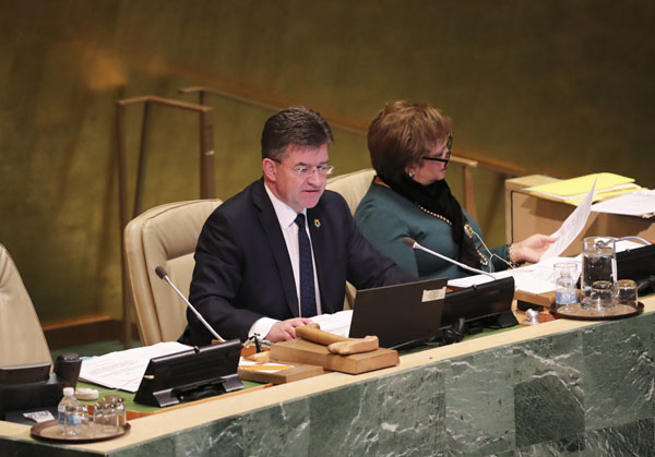 12月21日,在位于紐約的聯(lián)合國(guó)總部,第72屆聯(lián)合國(guó)大會(huì)主席萊恰克(左)主持聯(lián)合國(guó)大會(huì)緊急會(huì)議。新華社記者王迎攝