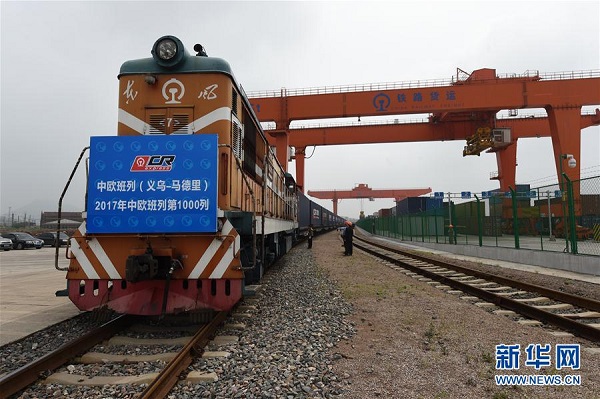 5月13日,2017年第1000列中歐班列從義烏西站駛出。當(dāng)日,X8024次中歐班列(義烏-馬德里)從浙江義烏鐵路西站鳴笛駛出。這列滿載小商品、服裝等貨物的列車是2017年開(kāi)行的第1000列中歐班列。中國(guó)鐵路總公司統(tǒng)計(jì)顯示,2017年中歐班列開(kāi)行數(shù)量較去年同期增加612列,增長(zhǎng)158%。新華社發(fā)(龔獻(xiàn)明 攝)