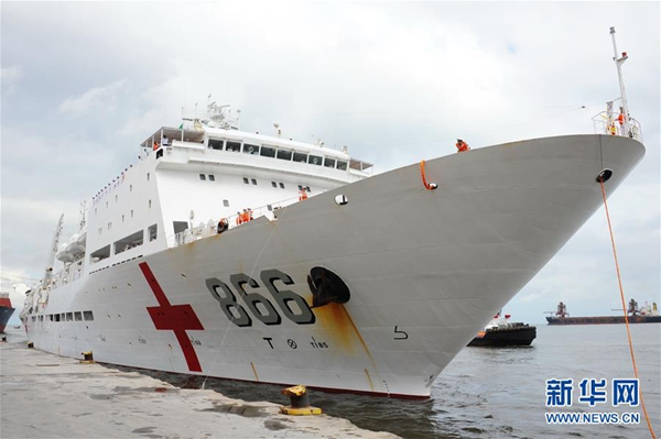 9月19日,中國(guó)海軍和平方舟醫(yī)院船停靠塞拉利昂弗里敦港。執(zhí)行“和諧使命-2017”任務(wù)的中國(guó)海軍和平方舟醫(yī)院船19日在任務(wù)指揮員管柏林、政委金毅率領(lǐng)下抵達(dá)塞拉利昂弗里敦港,開(kāi)始為期8天的友好訪問(wèn)并提供人道主義醫(yī)療服務(wù)。這是中國(guó)海軍艦艇首次訪問(wèn)塞拉利昂。新華社記者石松攝
