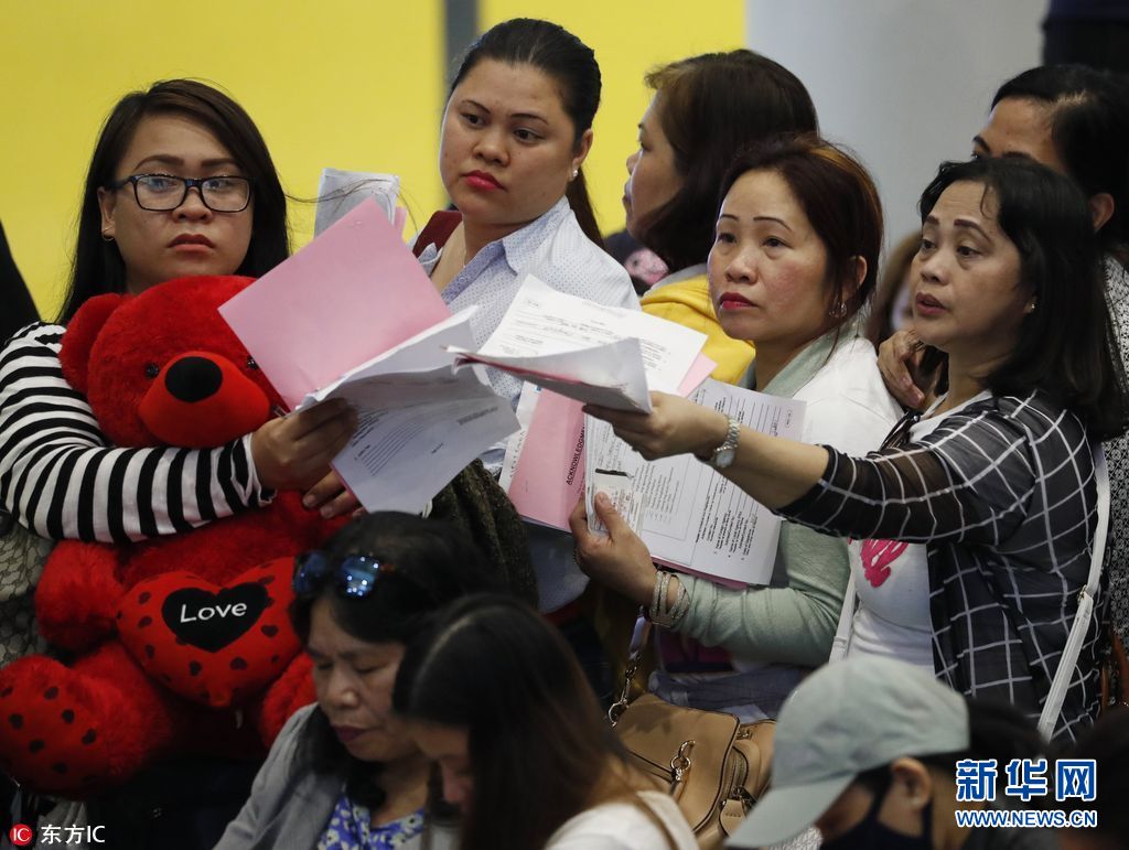 當(dāng)?shù)貢r間2018年2月21日,菲律賓馬尼拉,從科威特返回的菲律賓海外勞工抵達(dá)馬尼拉國際機(jī)場。據(jù)外媒報道,宿霧太平洋航空公司為至少396名海外菲律賓工人提供空運支持,助其免費搭乘飛機(jī)回家。據(jù)悉,菲律賓政府已下令禁止民眾前往科威特務(wù)工。據(jù)悉,菲律賓總統(tǒng)杜特爾特稱,近來有在科威特打工的菲律賓女傭因不堪虐待或性侵選擇自殺。(圖片來源: 東方IC)