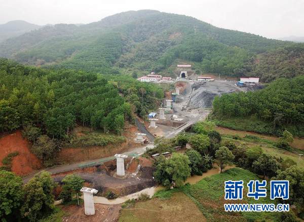 這是3月27日在老撾南塔省航拍的正在施工建設中的橋梁。新華網(wǎng)發(fā) 劉艾倫攝