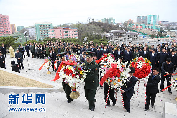 4月5日,在朝鮮平壤,中國駐朝鮮大使館在平壤友誼塔舉行敬獻花籃儀式,祭奠中國人民志愿軍烈士。新華社記者 程大雨 攝