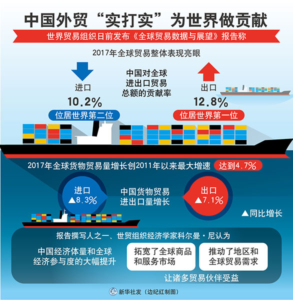 在世界經(jīng)濟(jì)遭遇保護(hù)主義、孤立主義挑戰(zhàn)的當(dāng)下,中國不但是促進(jìn)全球自由貿(mào)易、推動(dòng)建設(shè)開放型世界經(jīng)濟(jì)的積極倡導(dǎo)者,更為此做出“實(shí)打?qū)崱必暙I(xiàn)。世貿(mào)組織的數(shù)據(jù)頗具說服力:2017年全球貨物貿(mào)易量增長創(chuàng)2011年以來最大增速,達(dá)到4.7%,其中,中國貨物貿(mào)易進(jìn)出口量分別增長8.3%和7.1%,大大超過全球貿(mào)易增速。如果以對全球進(jìn)出口貿(mào)易總額的貢獻(xiàn)率來衡量,中國份額分別達(dá)到10.2%和12.8%。報(bào)告撰寫人之一、世貿(mào)組織經(jīng)濟(jì)學(xué)家科爾曼·尼認(rèn)為,中國經(jīng)濟(jì)體量和全球經(jīng)濟(jì)參與度的大幅提升,拓寬了全球商品和服務(wù)市場,推動(dòng)了地區(qū)和全球貿(mào)易需求,讓諸多貿(mào)易伙伴受益。