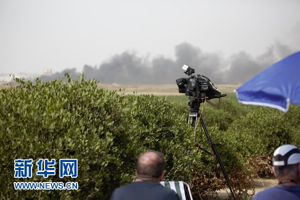 正午的驕陽烤得人大汗淋漓,被大風(fēng)卷起的黃沙一個勁地往眼睛里鉆。雖然記者的眼睛經(jīng)常被汗水和沙子蹂躪地睜不開,但是這并不妨礙記者用相機(jī)和攝像機(jī)記錄下加沙地帶那一頭發(fā)生的一幕幕??棺h的巴勒斯坦人燃燒輪胎所產(chǎn)生的濃煙,遮住了大片天空,刺鼻的焦味隨風(fēng)飄散。