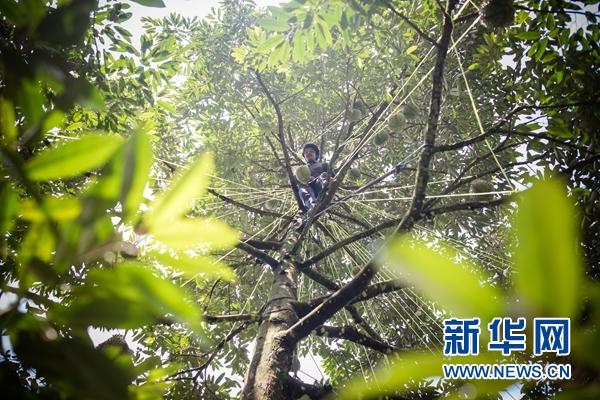 泰國(guó)莊他武里府果園中,工人在清晨爬上榴蓮樹(shù)采摘榴蓮。新華網(wǎng)發(fā) (阿里巴巴提供)